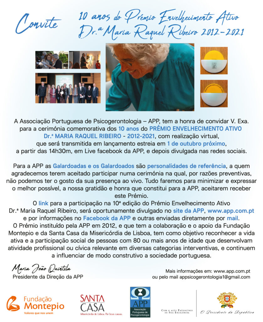 10 ANOS DO PRÉMIO ENVELHECIMENTO ATIVO – ASSOCIAÇÃO PORTUGUESA DE PSICOGERONTOLOGIA – APP – Convite