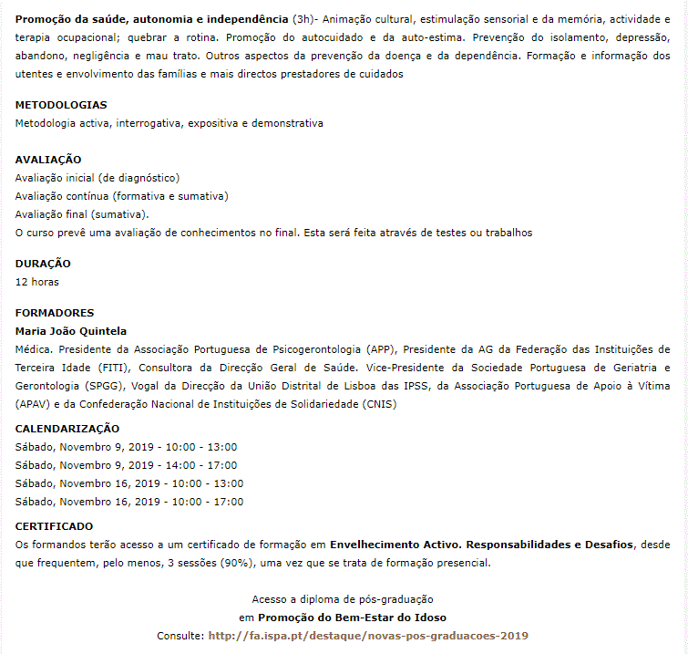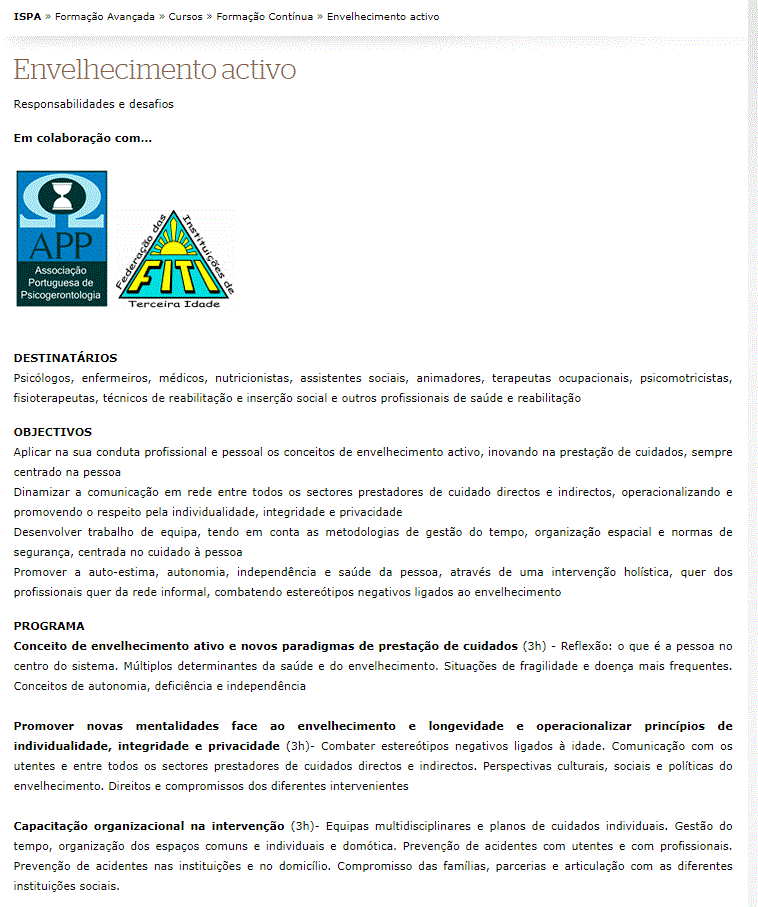 3º Curso ENVELHECIMENTO ACTIVO. Responsabilidades e desafios – ISPA