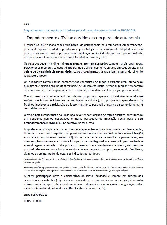 Texto elaborado pela Dra. Teresa Ramilo, Vogal da Direção da APP e Coordenadora do Grupo de Ação APP – GAAPP GERONTOMOTRICIDADE