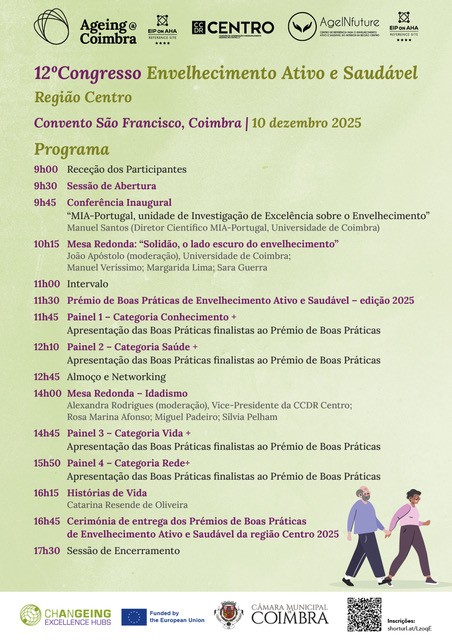 O Consórcio Ageing@Coimbra, o qual tem como um dos membros fundadores o Município de Coimbra, vai realizar o 12.º Congresso em Envelhecimento Ativo e Saudável, a decorrer já no próximo dia 10 de dezembro de 2025, na Sala D. Afonso Henriques (Antiga Igreja) do Convento São Francisco, em Coimbra.