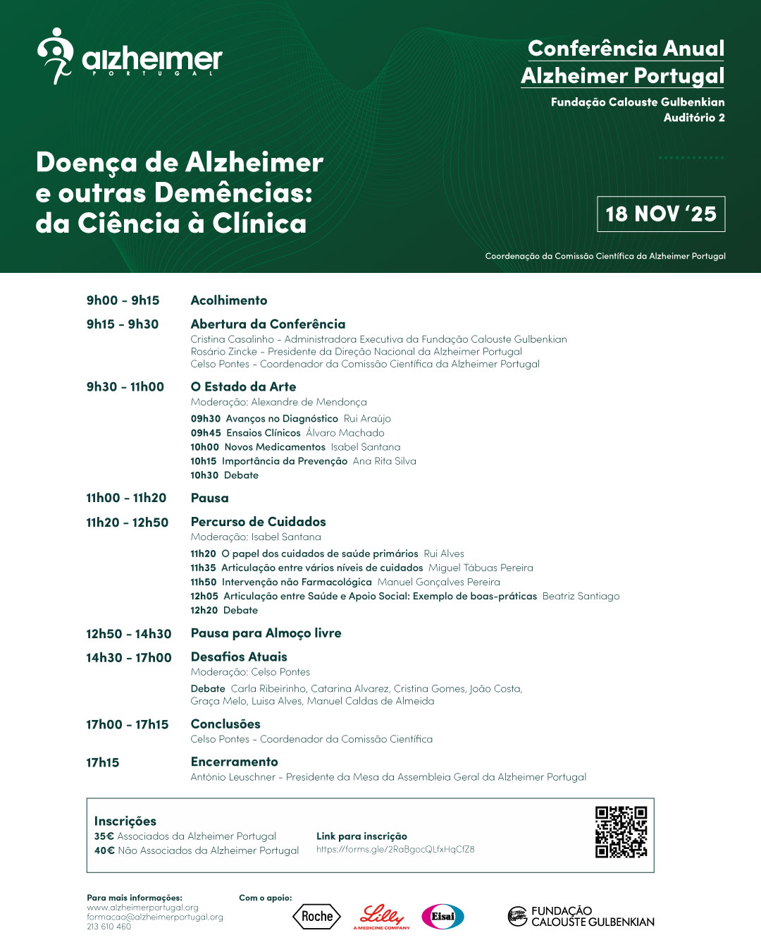 programa e demais informações/condições de inscrição, encontram-se disponíveis no nosso site em: https://alzheimerportugal.org/conferencia-anual-da-alzheimer-portugal-doenca-de-alzheimer-e-outras-demencias-da-ciencia-a-clinica/